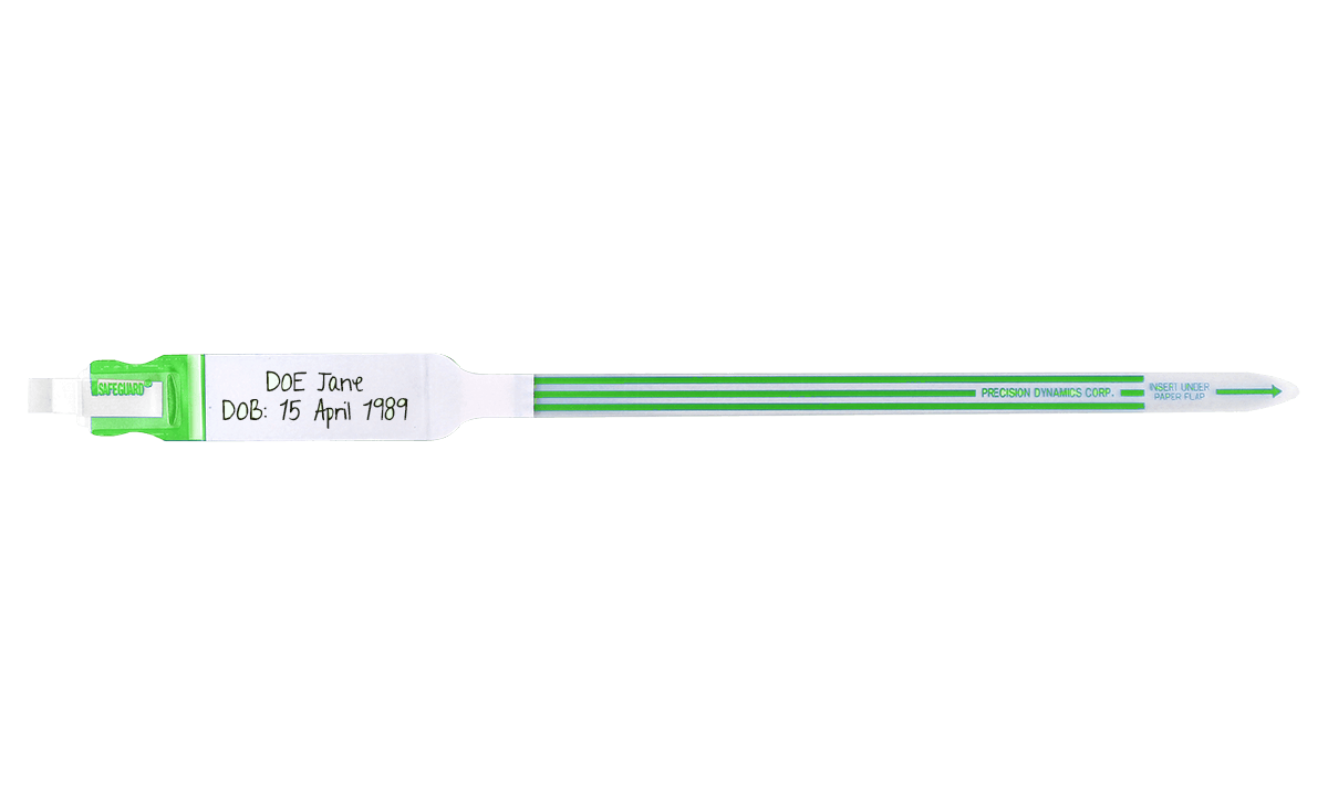 Nos bracelets Safeguard à inscription directe pour adultes et enfants sont fabriqués à partir de matériau résistant trilaminé et sont munis d'une fermeture adhésive.
